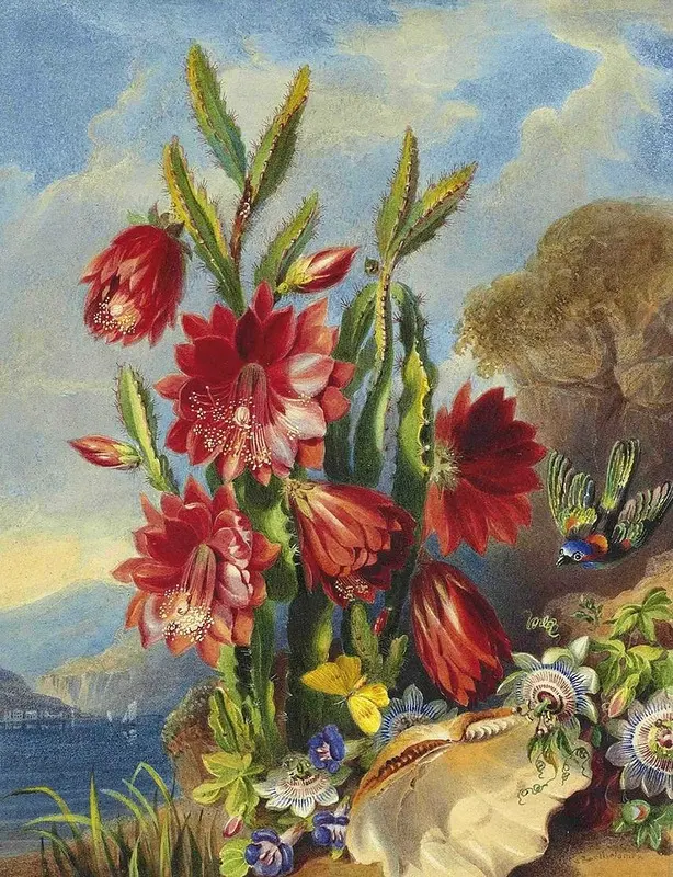 Valentine Bartholomew [1799-1879], British painter, became an early member of the Society of Painters in WaterColours, which he joined in 1835. He had a special talent for flower painting, a branch of art which he pursued with much success, his works being chiefly remarkable for the great care and the large scale on which they were carried out. "Azaleas" and "Camellias" are in the South Kensington Museum. Bartholomew held for many years the post of Flower painter in Ordinary to the Queen from 1837.