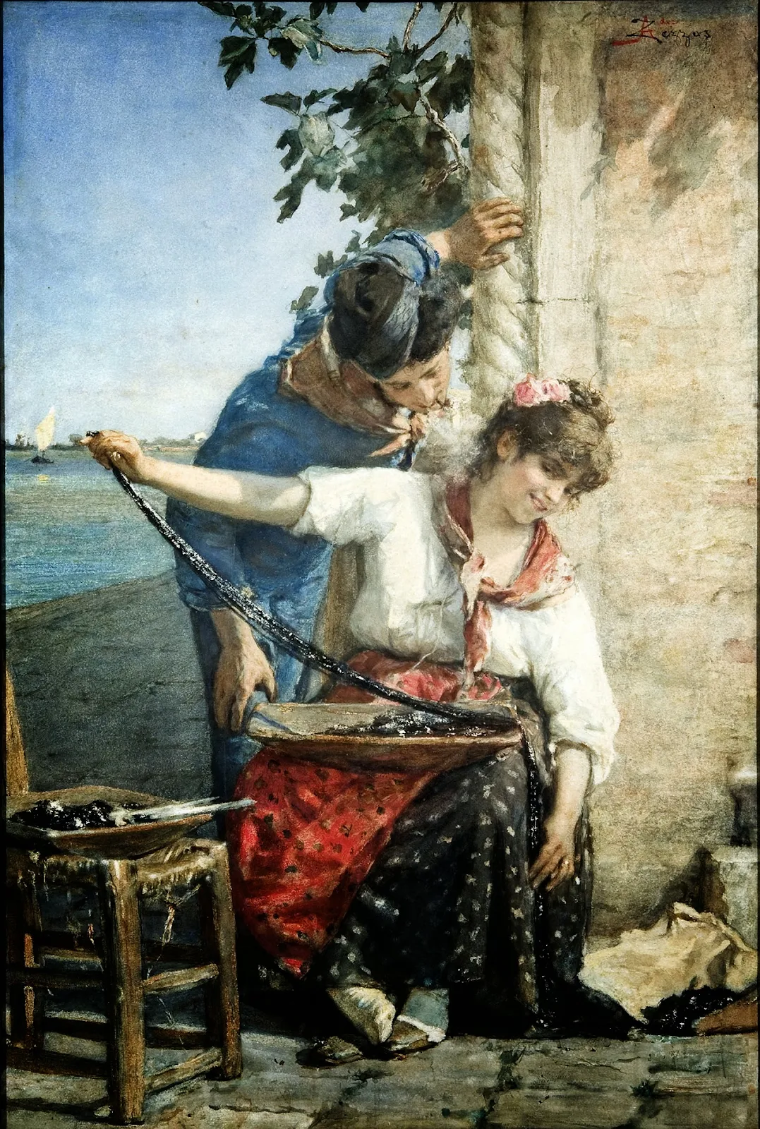 Alessandro Zèzzos (Venice, 1848 - Vittorio Veneto, 1914) was an Italian painter of genre scenes, costume scenes, portraits and vedute, in watercolors and oils.