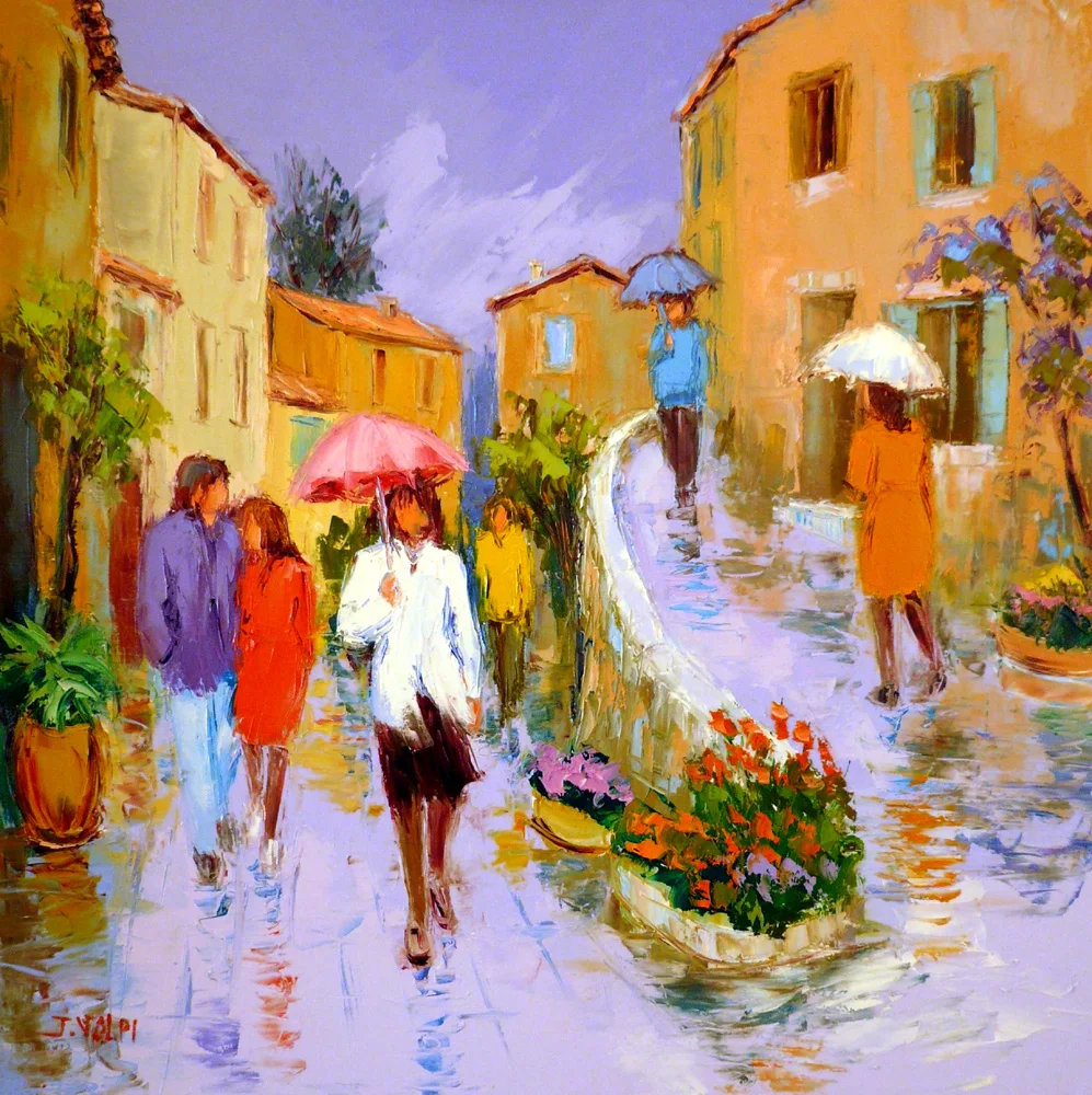 He paints by using the technique of the "knife". The subjects are animated by persons, the colours are lively. It is famous for his persons in the rain of noon of France. He exposes internationally and the works are a part of prestigious collections all over the world.