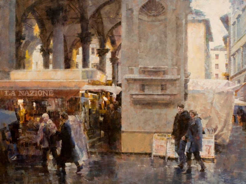 An ongoing series of paintings depicts life in his maternal grandfather's hometown of Lucca in northern Tuscany, where he regularly visits.