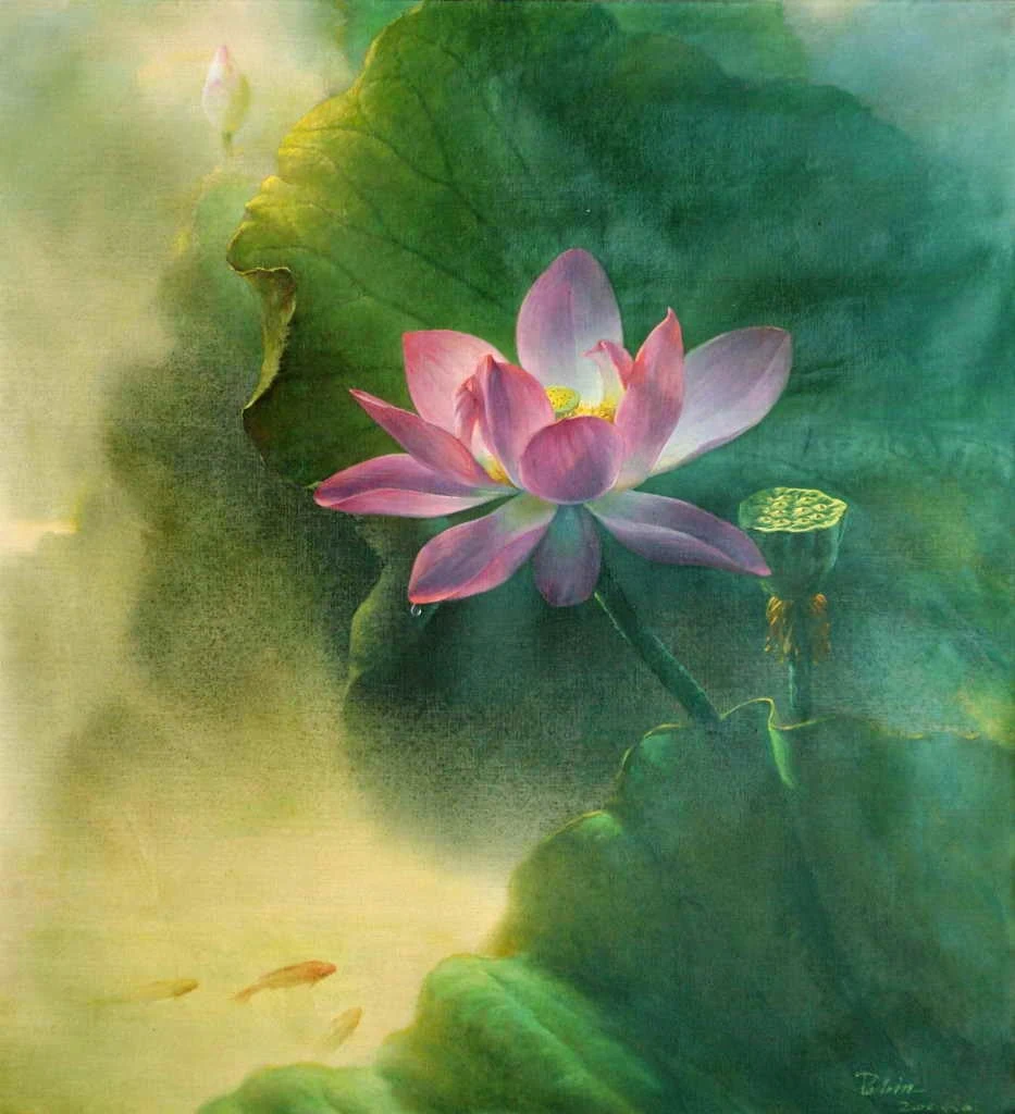 His main subject, the lotus series of works can be said to be a combination of a breakthrough from a rigorous traditional realism toward Chinese painting freehand techniques.
